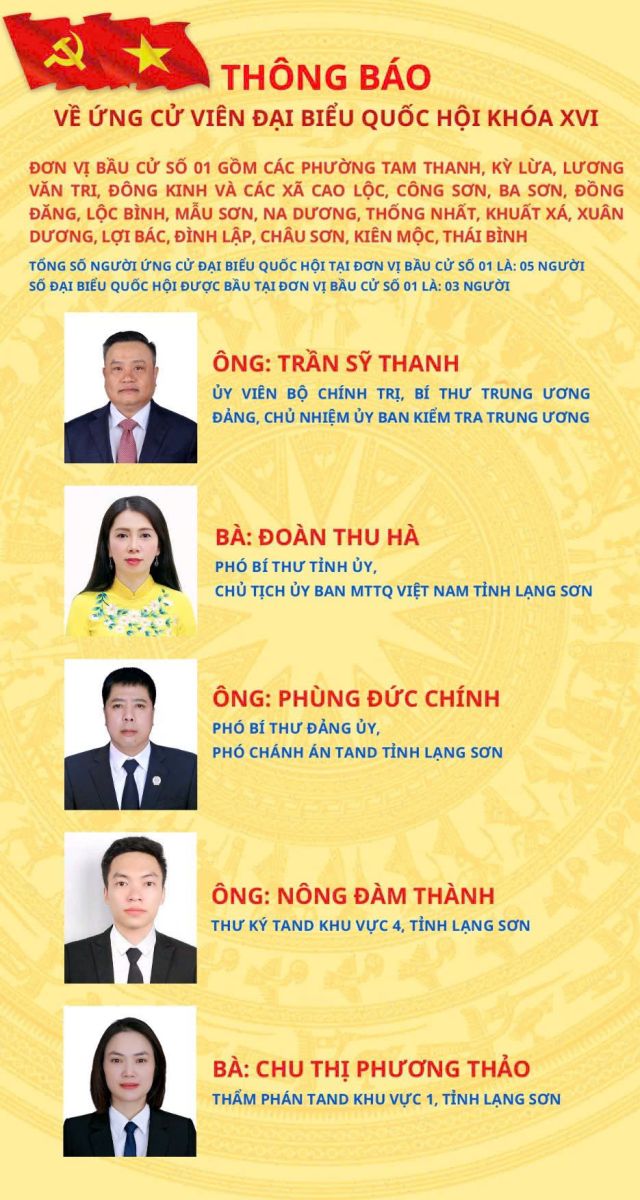 Đơn vị bầu cử số 01 gồm các phường: Tam Thanh, Kỳ Lừa, Lương Văn Tri, Đông Kinh và các xã: Cao Lộc, Công Sơn, Ba Sơn, Đồng Đăng, Lộc Bình, Mẫu Sơn, Na Dương, Thống Nhất, Khuất Xá, Xuân Dương, Lợi Bác, Đình Lập, Châu Sơn, Kiên Mộc, Thái Bình.