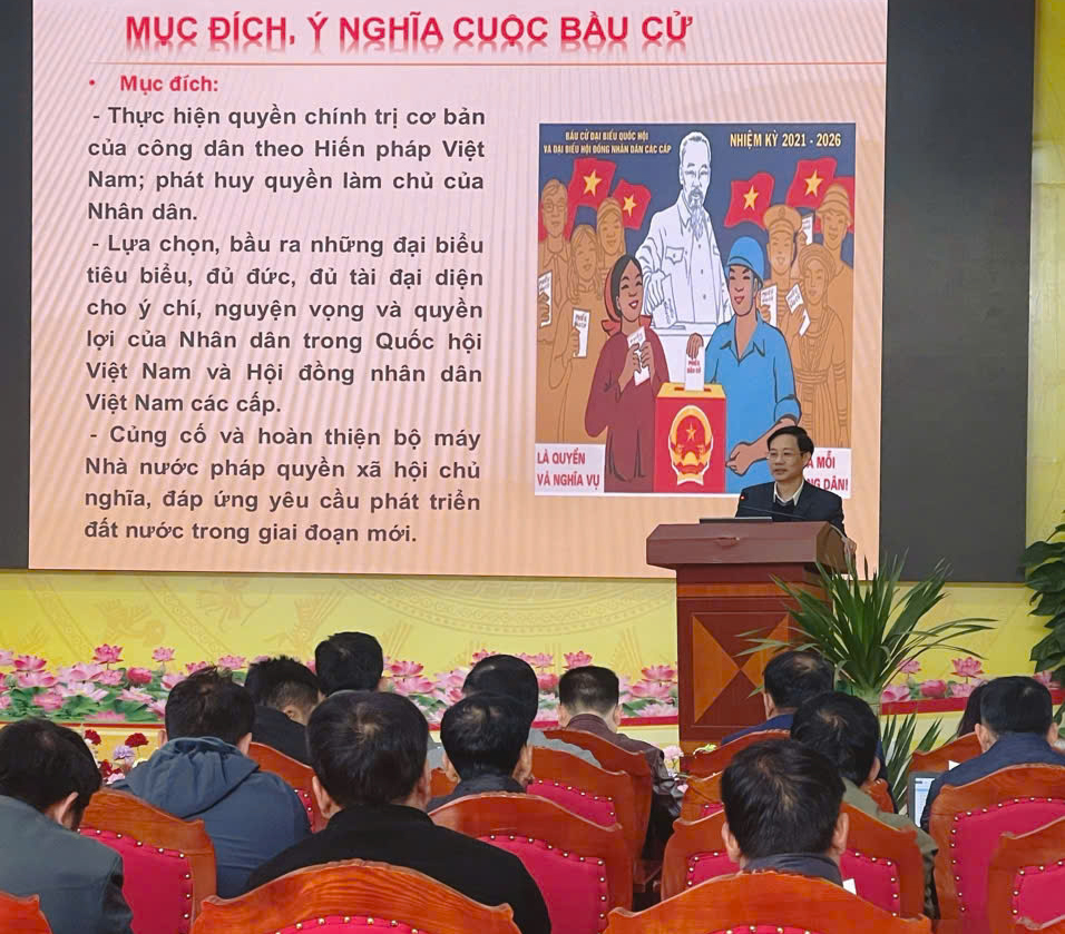 Tại Hội nghị, các đại biểu và Nhân dân được phổ biến những nội dung cơ bản về mục đích, ý nghĩa của cuộc bầu cử; thời gian tổ chức bầu cử; các nguyên tắc bầu cử; quyền và nghĩa vụ của cử tri cùng một số nội dung quan trọng liên quan đến công tác bầu cử theo quy định của pháp luật.